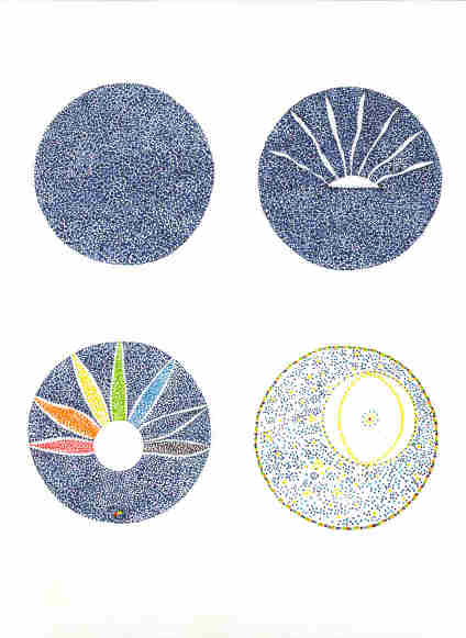 There are a total of one hundred mandalas (four mandalas per page), all done in pointillism. Commenced work in Morocco, 1972 and completed same year on island of Madeira.